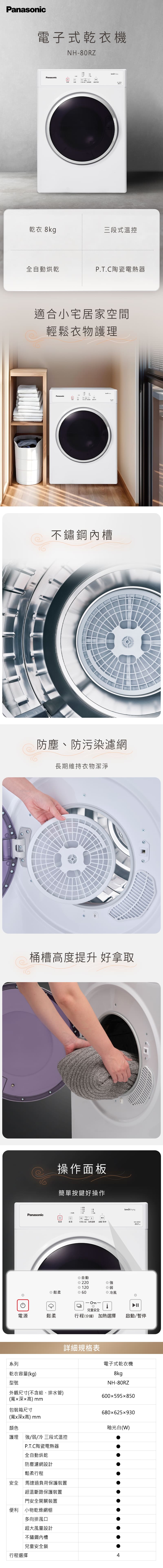 【Panasonic】電子式乾衣機 (NH-80RZ-W)