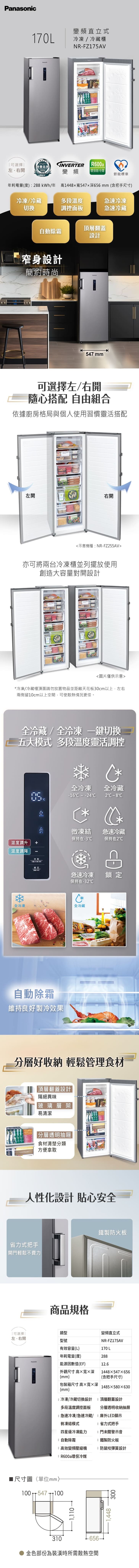 - 【Panasonic】170L直立式冷凍櫃(NR-FZ175AV)